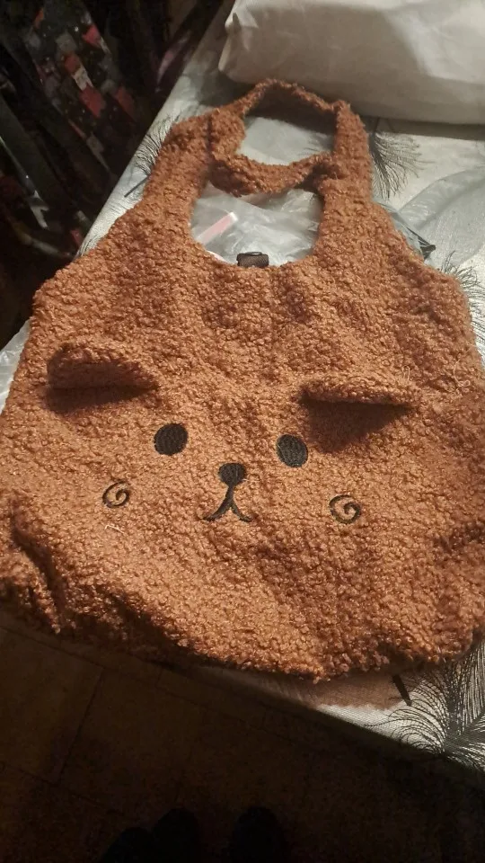 Carry your essentials in irresistible comfort with this Sherpa Bear Tote Bag. Made from huggable teddy fleece, this spacious bag features an embroidered bear face, charming 3D ears, and a stylish gingham lining. Perfect for adding a cozy, kawaii touch to your everyday outings.